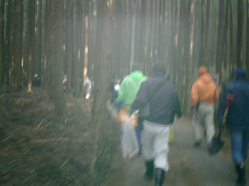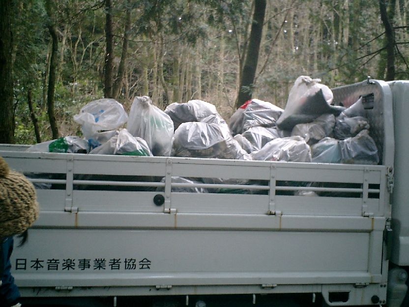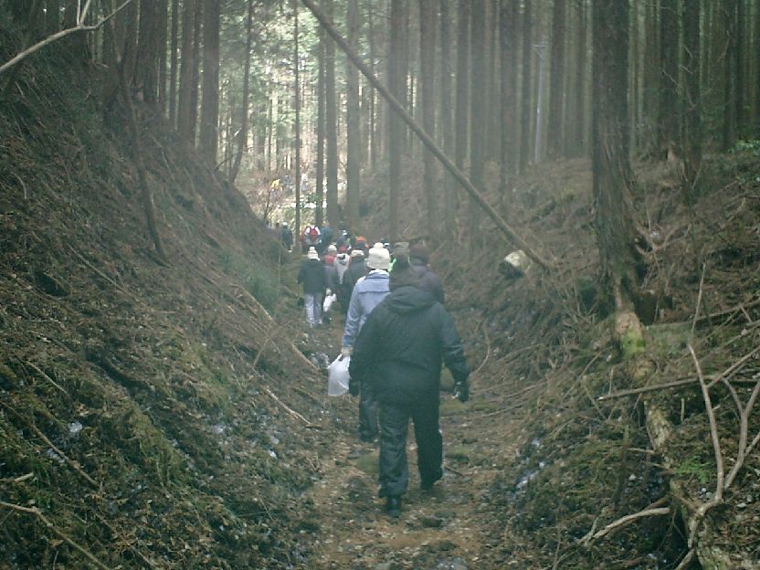 休憩後の後半は集めたゴミを崖上の林道にバケツリレーで運び出し