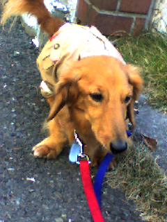 ハーネス側のリードを真上に軽く引き歩くのを促すと