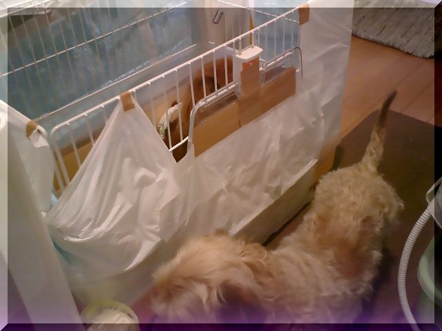 今回は留守番訓練対策にゲージの回りに幕を張ってます。